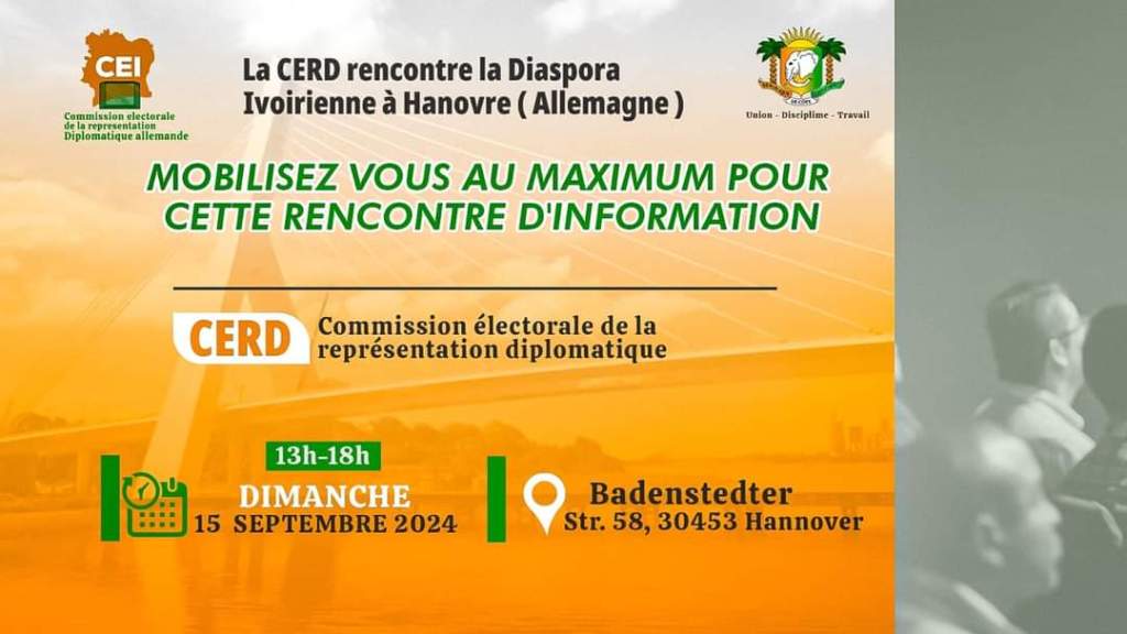 🔴HANNOVRE ,DIMANCHE 15 SEPTEMBRE 2024 - 13H à 18H, Adresse : Badenstedter Str. 58, 30453 Hannover Rencontre avec la Communauté ivoirienne Tous les membres de la Communauté ivoirienne sont invités à prendre part à ces importantes rencontres d'information et d'échanges sur le processus électoral en Côte d'Ivoire.